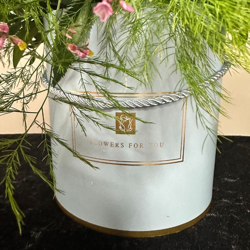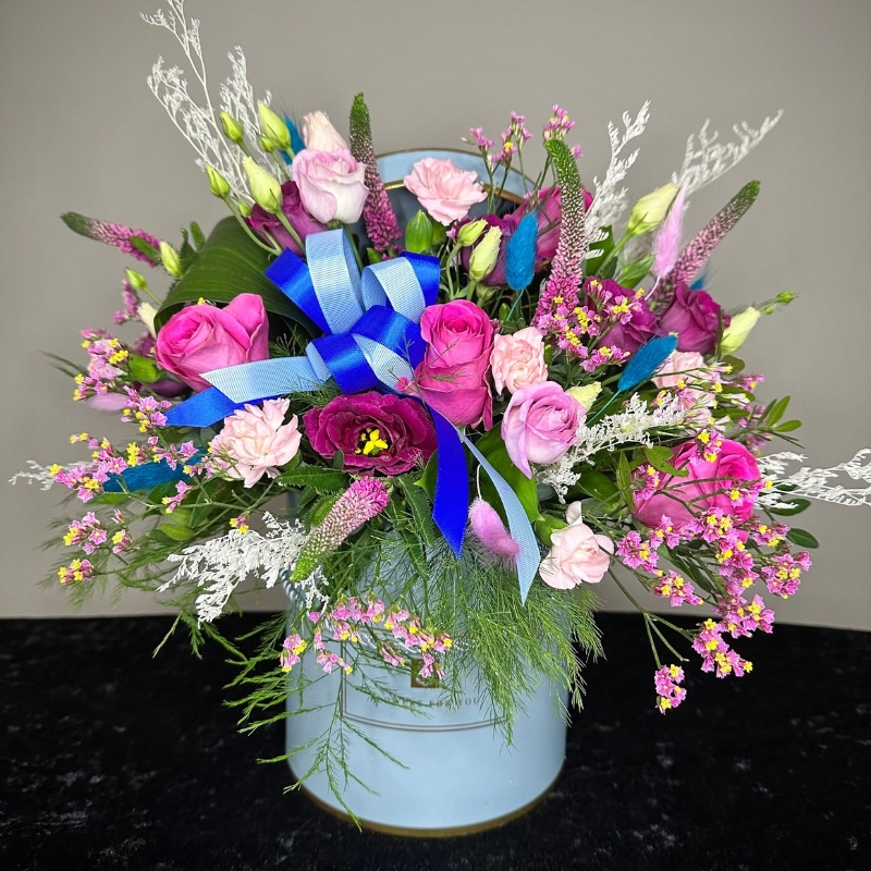 This tall elegant hat box is filled with gorgeous flowers and mixed greenery appearing to grow from under the lid. Of course once the flowers are finished the recipient gets to keep the hat box to reuse for a long time to come.