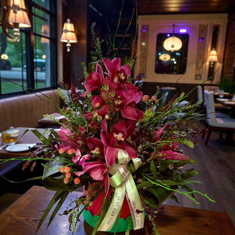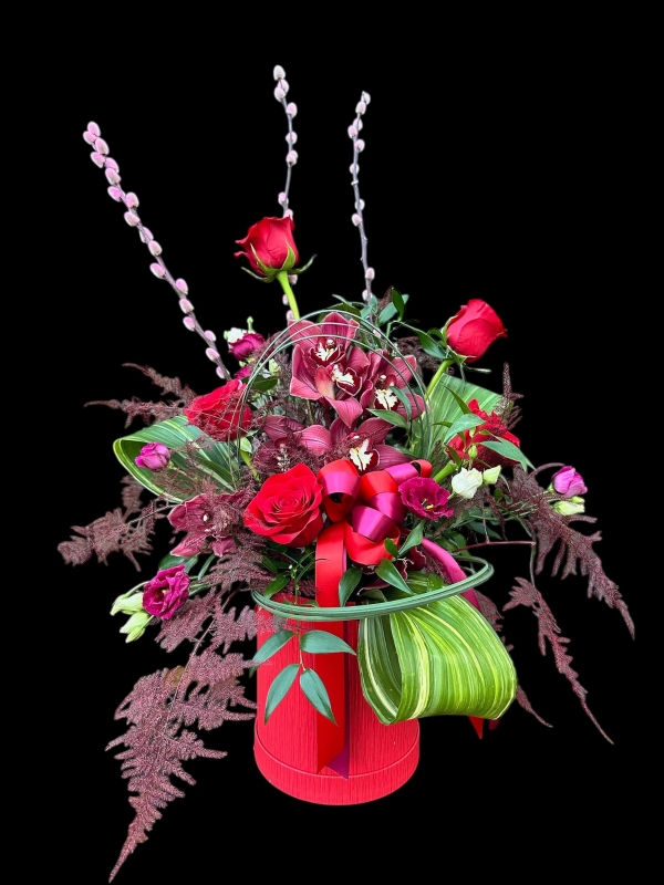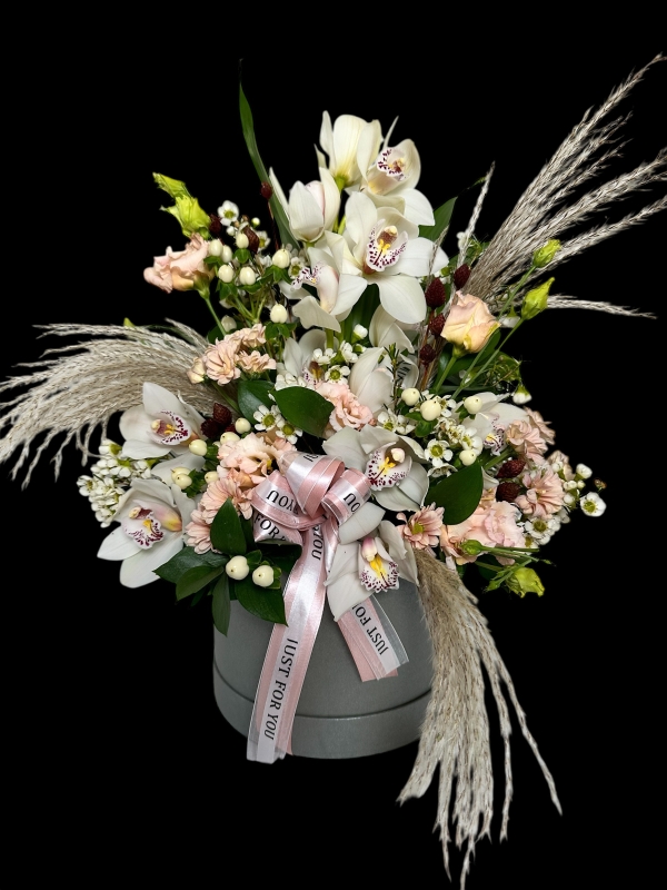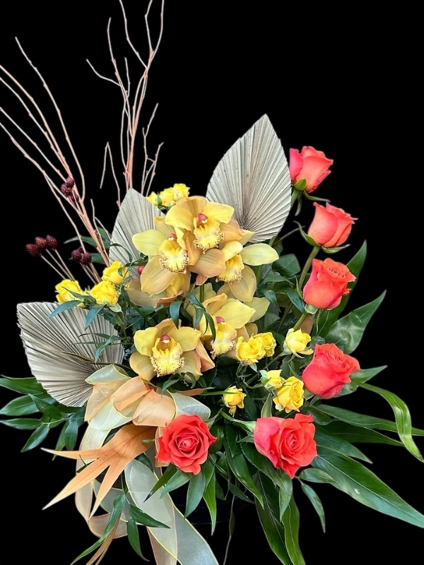 These Hat Boxes are taller than the standard size and filled with a mix of flowers including unusual and luxurious flowers, usually with Orchids. (Orchids may be substituted for another flower of equal value should they be unavailable at market).