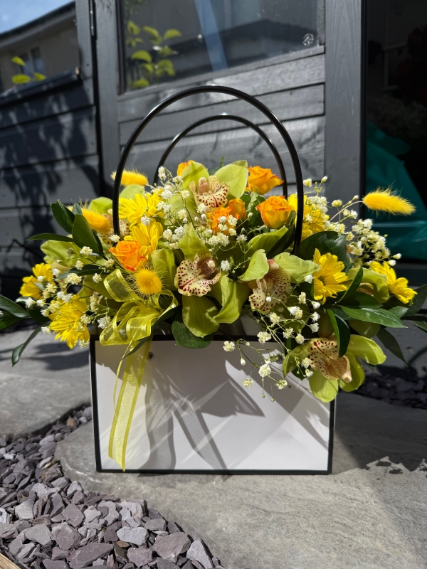An arrangement of flowers in a handbag shaped sturdy bag. This twist on the hatbox brings a different shape and style to your gift, made with florist choice flowers and greenery to match your selected colour choice.