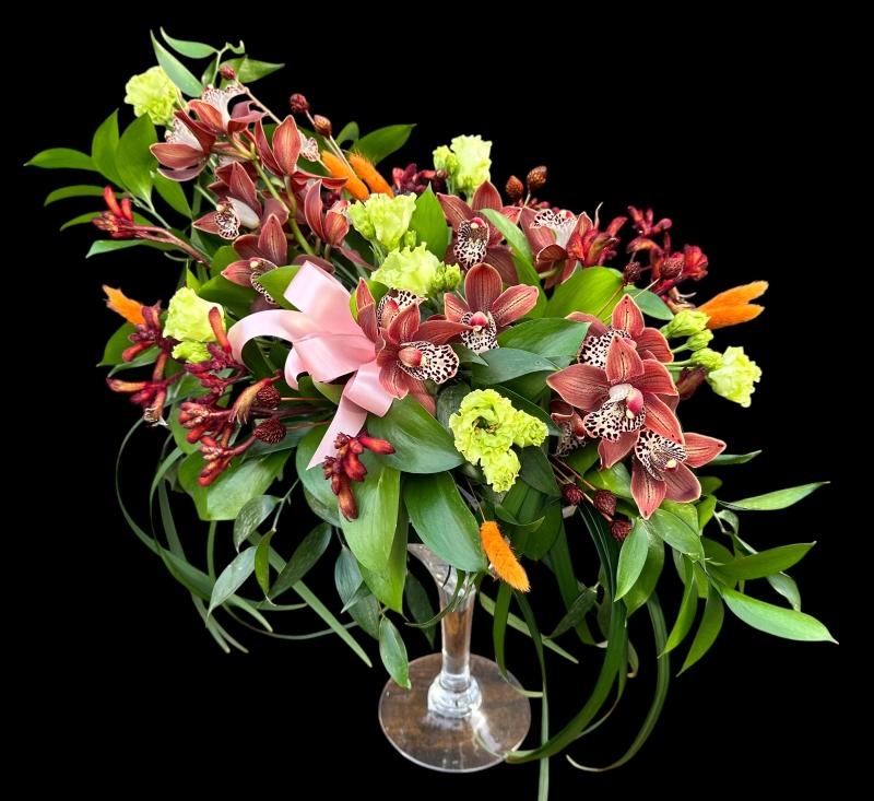 This stunning arrangement really is a show stopper (pictures don't do it justice). A large martini glass filled with sparkling gems is overflowing with mocha coloured orchids, tropical accents and various greenery. Once the flowers are finished the recipient has a large display glass to reuse in the future.