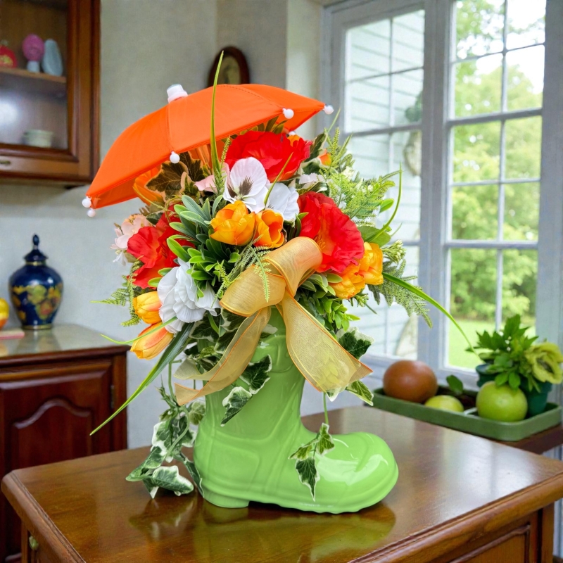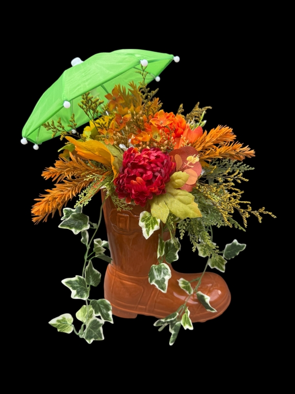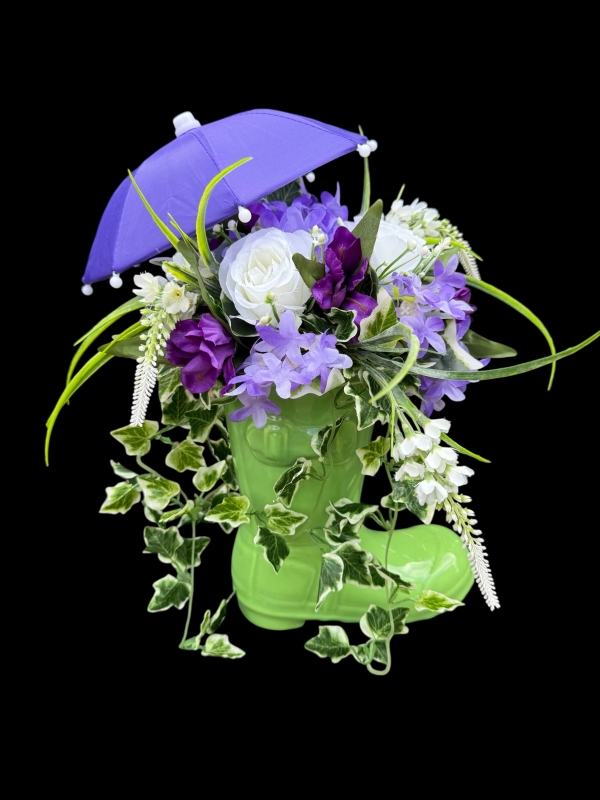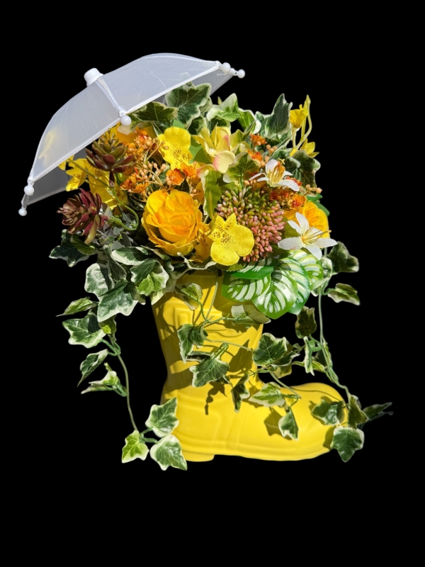 These ceramic boots filled with silk florals and greenery are such a fun and unique gift! With a mini umbrella on top to match the colours this statement piece will last for a very long time giving a fun talking point in your home or sheltered patio.