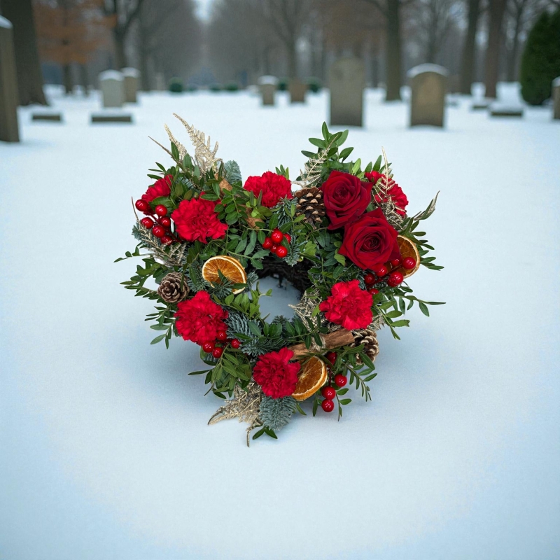 This rustic memorial tribute is perfect for a graveside. Made with fresh festive greenery, flowers and accessories it can be made in a heart shape, round or cross shaped.
