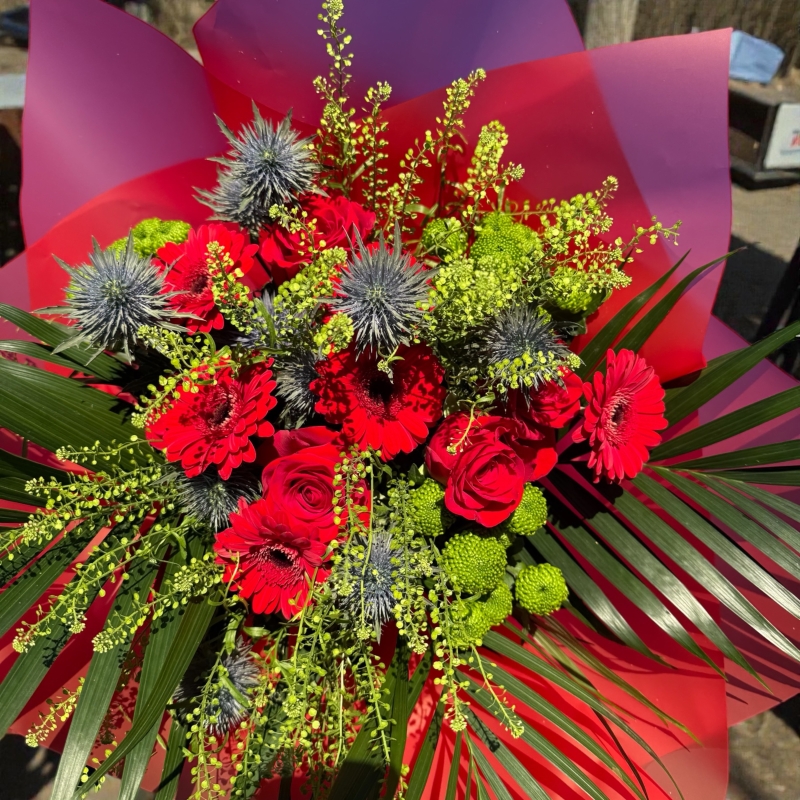 This bouquet combines 6 red roses with 6 gerbera, thistles, chrysanthemums and greenery.
